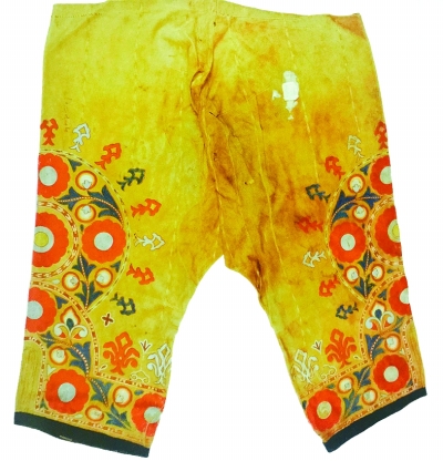 清代哈萨克族鹿皮绣花男裤,新疆博物馆藏。