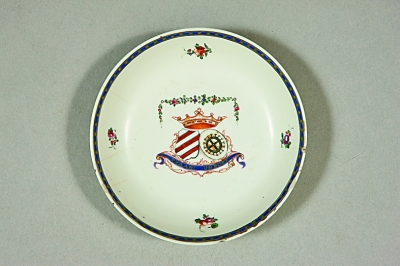 据介绍,故宫所藏的这个瓷盘,纹章是荷兰范·斯宾与范·霍根多普两大家族的徽章组合。瓷盘的主人是范·斯宾男爵(1746~1827年)与其妻萨拉·乔安娜(1755~1828年),可能是1785年两人为了庆祝铜婚纪念而专门定制的瓷器。荷兰阿姆斯特丹博物馆藏有一件同样的徽章瓷盘,器形为花瓣口,应属于同一套瓷器。
