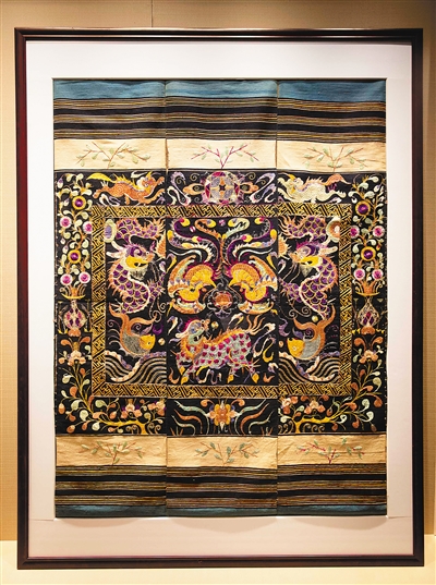 黎族鱼跃龙腾双凤朝阳图三联幅龙被。