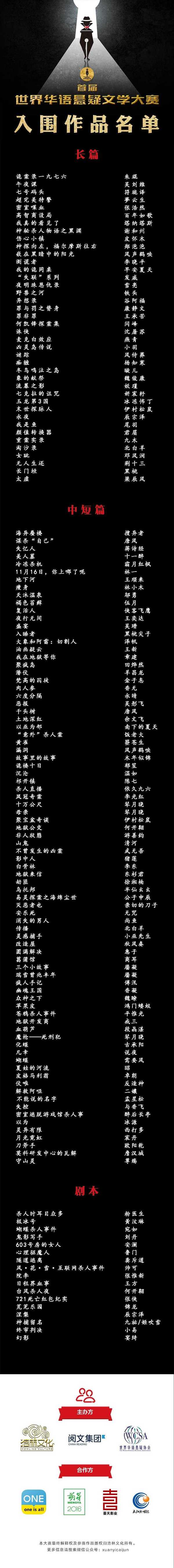 由上海浩林文化传播股份有限公司携手阅文集团联合主办的首届世界华语悬疑文学大赛,秉承公开、公平、公正的原则,已经评选出139篇入围作品: