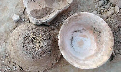 喇家遗址面条出土时的红陶碗和碗中遗物