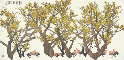 他从歌唱中汲取毛笔字书写时的技巧,又在水墨画的谋篇布局中运用从音乐旋律的行进里得到感悟,他说:“大家都知道五线谱,旋律的音符在五线谱上就好比一根根‘豆芽菜’ ,而且是起起伏伏、有上有下的‘豆芽菜’ ,而音乐的旋律正是因为有了这起起伏伏、有上有下才悦耳动听。那么我就想,为什么我不能按照五线谱中的音符感觉来构思布局构思画面呢?比如说,画一幅水仙图,把参差错落的音符变成花朵,灵动的水仙就栩栩如生了。 ”