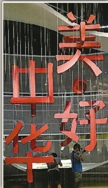 “复行数十步,豁然开朗”,“美·好中华”四个红字悬置空中,细看文字,却并非整体,而是用一个个笔画模块构成,既有立体的视效,又暗含隐喻。海德堡大学美术史家雷德侯在其名作《万物》中曾提出,中国艺术的一大特色,就是模件化生产,从汉字到图像,从兵马俑到青花瓷,从青铜器到印刷术,概莫能外。“美·好中华”四字以笔画模件构成,或许也希望以此形式,隐喻“美·好”背后的运作机巧和营造理念。围绕着主题红字,序厅半周陈列了此次展览各个时代的代表性文物,来为观众预热。在文物背后的薄幕背景上,播放着一个个飞升的文物图像,飘飘然如文物的魂魄羽化登仙。