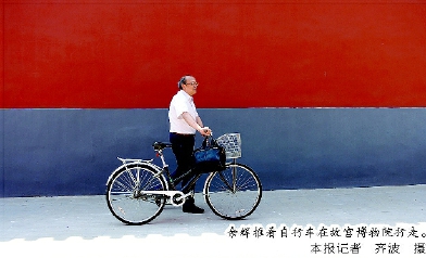 ◆余辉简介 第十一、十二届全国政协委员,国家文物鉴定委员会委员,故宫博物院研究馆员,历任故宫博物院书画部主任、研究室主任等。 余辉推着自行车在故宫博物院行走。 本报记者 齐波 摄