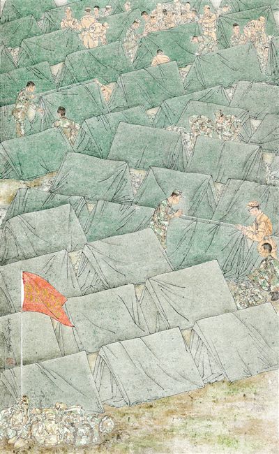 当然,怎样从这些多种多样的古代绘画资源中汲取营养、借鉴转化,有效促进当代军事题材美术创作,并不是一件容易的事情。近年来,随着军事文化的提升,也得益于时代资讯的发展,中国的军事美术教育、军事题材美术创作,在传承、转化与弘扬民族艺术的道路上,不断推进和深化。纵观两千年中国绘画史,由于中国画工具材料的特殊性,艺术语言的拓展和创新,往往肇始于新题材的挑战。从这个角度来观察和思考,现当代军事题材美术创作有十分广阔的艺术空间。新中国的几代前辈画家,在军事题材绘画艺术的探索上,做出了卓越的贡献。新时期以来,随着新军事变革的推进,依托军事美术教育的摇篮和广泛深入基层的有组织的军旅美术创作,更多的中青年军队画家成长起来,在艺术理念、绘画题材、绘画手法等多方面,勇于尝试,逐步开拓出一片新天地,并在最近的几届全军美展中有所呈现。