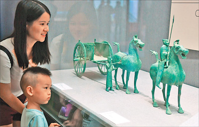 3日,河北博物院的《茶马古道——八省区文物联展》展馆内人头攒动,来自甘肃、内蒙古、广西、四川、云南、西藏、陕西、青海等地的340余件(套)文物集中亮相,向民众展示了散落在中国最古老驿道上的茶具、马具、石器、青铜器、货币、造像、丝织品等多种珍贵文物。图为一对母子在河北博物院内参观。