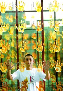 图为樊建川在老兵手印广场。这个广场是他征集了4000多枚抗战老兵手印建成的。他说,正是这些当年挥舞大刀长矛、掷手榴弹、埋地雷的手,挡住了来势汹汹的日本侵略军,力挽狂澜,这些功勋卓著的手应该留下来。