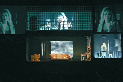 这是一版理念极其先锋的制作,导演特雷林斯基对原作的重新构建非常大胆。特雷林斯基导演将全剧三幕的剧情全部移植到钢铁战舰上,这里看似仅仅是剧情发生地的简单变动,但其实充满了“合理性”层面的挑战。特雷林斯基导演以大范围的视觉调度解决了这一难题。第一幕“九宫格”式布局的战舰横截面,将船舱分割为九个独立的空间,第二幕则实现了从顶层甲板的控制室到底层弹药舱的转换,第三幕观众的目光又聚焦在封闭的病房中,如果细细算来,观众在剧中一共看到了四层、十二个不同的视觉空间,同样体量的布景足够完成一部电影的拍摄。如此丰富的舞台设计为男女主人公留下了足够的表演区域,也解决了观众长达五个小时观演中视觉上的枯燥乏味,当然最重要的是让剧情的每一步发展都足够自然流畅。在第三幕中,特里斯坦以大段篇幅回忆自己的一生,特雷林斯基直接将童年记忆以实景呈现,烧焦的木屋赫然出现,极为写实的木屋与钢铁战舰的氛围形成强烈对比,将原本理解难度巨大的唱词与童年伤痕联系在一起,即使初次接触这部歌剧的观众,也不难感受到其中的凄惨。