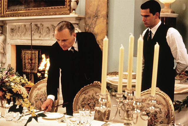 史蒂文斯口中的获得“尊严”,等于是建功立业的一种修辞。为了管家的“尊严”,这两次会议上,他都为了服务权贵而从亲爱的人最迫切的需求面前走开,一次是弥留之际的父亲,一次是哭泣着决心嫁与他人的肯顿小姐。电影做了稍许美化,前一次将弥留改为了刚刚去世,后一次增加了他在心烦意乱中摔碎酒瓶的情节。