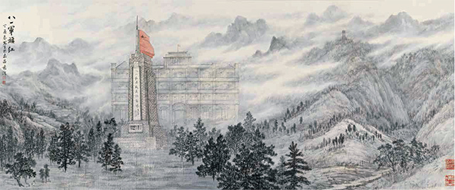 “文艺是时代前进的号角,最能代表一个时代的风貌,最能引领一个时代的风气”。这是习近平总书记在文艺工作座谈会上的重要讲话中所强调的。董希源多年来的红色写生,自觉践行总书记的讲话精神,写生成果是多方面的。通过写生,他不但丰富、夯实了个人的创作,也进一步体悟到“艺术可以放飞想象的翅膀,但一定要脚踩坚实的大地”的深意,懂得了“人民是历史创造者”的道理,认识到如何才能“为人民抒写、为人民抒情、为人民抒怀”。他用栩栩如生的作品形象向人们讲述我党我军的光荣历史,呈现出这个时代的主旋律。董希源这批大尺幅红色题材写生作品,倾注心血,饱含深情,以他对传统国画研修所积累的学养,以自身对艺术创作规律的感悟和对艺术本体精神内涵的理解,在红色历史题材的写生与创作两个命题的结合上,在传统笔墨表现当代意境方面做出了诸多有益的探素。特别是他的倾情力作《万里海疆图》更是令人印象深刻。这件37米长的作品紧紧围绕习近平总书记提出来的“听党指挥,能打胜仗,作风优良,努力开创强军兴军新局面,实现中华民族伟大复兴的强国梦、强军梦”这个创作主题,采用全景式的表现手法,以大视野俯瞰的视角,详细描绘了在陆海空、火箭军和战略支援部队组成的钢铁长城坚强有力的保卫下,从我国北疆的阿尔山市三角山边防哨卡到最南端的曾母暗沙等的万里海疆壮丽秀美、和平发展、生机勃发的宏大场面。可以说,这部长卷是近年来我国红色题材创作中难得的一件具有史诗品格、彰显中国精神、催人奋进的佳作。