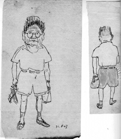 父亲过世后,我一直想找到这两幅画,不知是夹在哪本书里,还是父亲又还给高莽了。我曾向高莽先生要过,他给了我一些复印件,但都是从干校回来以后的画,没有这两张。他说:我随手拿张纸就画,画了不少,找不到了。你要是能找到拿给我,我重新画过。见到这两张小纸片上的画,我心中狂喜,第一反应就是:我要拿去给高莽先生看,他一定也会觉得有意思。