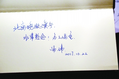 最后,记者请师伟给《北京晚报》的读者写几句话,老人高兴地答应了。想了片刻,她在纸上用娟秀的字体写道:北京晚报读者,非常想念,多多保重!