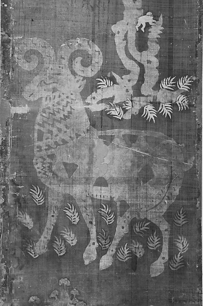 这个屏风高1.63米,染成黄色后上蜡,然后再染红色,这样上蜡的部分就形成了图案:一株大树下站着一只卷角羊,羊身上有几何形图案。这个屏风不光工艺精美,更是古代丝绸之路交流的重要例证。根据屏风上的墨书记录,这个屏风是751年之后在日本制作的,然而上面的卷角羊原产于伊朗,当时的日本人是不可能见到的,那这个屏风是怎么设计的呢?很显然,中间的关键环节就是中国唐朝。