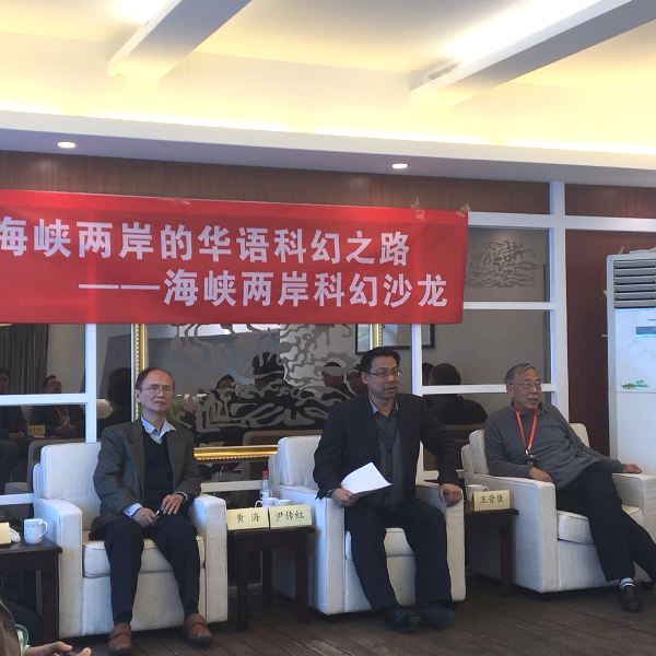 2017年11月18日上午,在北京嘉华世纪凤皇社举办了“海峡两岸的华语科幻之路”沙龙,该活动为“繁荣科普创作,助力创新发展”系列沙龙第十一期,由中国科普作家协会主办,成都时光幻象公司(中国科普作家协会单位会员)承办,疆君编剧工作室协办。来自台湾地区的以著名科幻作家黄海为首,有林健群、李知昂、林天中(石林散人)、陈厚岐(欧若奇)等科幻作家、学者,与大陆当代科幻界领军人物刘慈欣、吴岩、王晋康、韩松、董仁威、姚海军、何夕、陈楸帆、江波、吴显奎等进行了对话。海内外著名科幻作家、科幻理论家、翻译家、出版人刘宇昆、三丰、顾备、胡绍晏、赵晓旭、杨枫等也参加了交流。