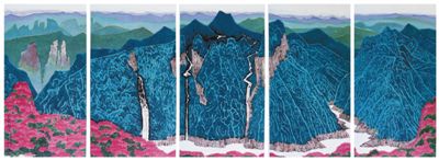 他弃用淡墨渲染的旧势,以重彩点染《井冈主峰》,青绿在曙红的映衬下,更显群峰苍翠的秀美与崇高;他突出线条处理,以大面积的山石勾勒,强化《太行山之铜墙铁壁》的巍峨;他将梁家河的桃花、映山红规模化,进一步渲染《梁家河可美啦》的艺术表现;他多次到塔克拉玛干沙漠边缘与叶尔羌河畔的麦盖提写生,将金秋时节盛开的刀郎花错落铺陈,《万顷刀郎花》美不胜收……