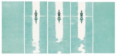 在陈家泠笔下,“三潭印月”水天一色,湖面清波荡漾,以淡墨晕染于绢上,更显幽深静雅;“柳浪闻莺”是线的世界,拂面的柳丝柔美地飞舞着,尽展春日西湖的勃勃生机;“花港观鱼”以色彩取胜,“花著鱼身鱼嘬花”,一派鱼乐人欢的场景……十件作品风格各异、形式各异,各尽其妙,各现其境,最终以五条屏的形式,统一为一个整体。那是他对家乡、对母校感恩又眷恋的情感表达。