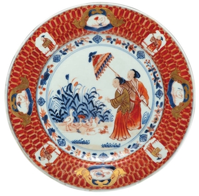 清代仕女画面的瓷器在外销瓷中十分常见,如仕女撑伞、仕女梳妆、仕女观斗鸡、仕女采桑、仕女放风筝等,足见当时欧洲人对仕女题材瓷器的喜爱。本文所要介绍的这件清乾隆青花矾红描金瓷盘,饰以撑阳伞仕女图,源自考纳利·普朗克画作,盘外壁绘有青花昆虫。此盘直径23.5厘米,高2.5厘米,足径13.5厘米。盘面纹饰以青花矾红描金等技法并用绘制图案,制作精美,华贵典雅,光彩照人。盘面图案布局合理,共分三层:盘中心为撑伞仕女图,阳光下,池塘畔,水草茂盛,鲜花绽放,禽鸟欢跃,一衣着华丽的女主人伫立欣赏美景,身后一侍女为其撑伞遮阳;第二层以一周折枝花草装饰;盘沿部分则以矾红描绘锦地,留出8处开光,开光内绘有仕女、飞禽等两两对称的边饰。盘背面还有不常见的青花昆虫纹饰。这类图案的瓷盘是外销瓷中的佳作,颇受海外欢迎,外国许多博物馆中也有展示,并被列为“特别订制”瓷盘。不少外销瓷书刊均有记载,拍卖会上价格不低,很为藏家追捧。