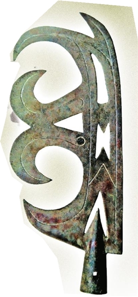 这件钩戟长37.7厘米,宽15.2厘米。尖端分叉,上锋较长,下锋较短,器身有三处镂孔,形状均不太规则。背部有左右相反的弯钩形装饰,下有短銎,銎上有长方形穿孔。这种形状的钩戟非常罕见,宝鸡竹园沟西周墓地曾出土一件亦有类似的钩形装饰(图二),但区别还是很大的。结合这两处墓地的年代,这件钩戟应为西周早期的兵器。此器造型奇特,装饰风格繁琐夸张,鲜有与之相同者。陈昭容研究员认为应该不是实用器,推测或为仪仗之用。这是戴家湾墓地出土的最有特点的兵器,为研究其文化来源提供了重要线索。考虑到它与竹园沟出土的青铜戟有相似之处,不排除两者曾受到相同文化之影响。