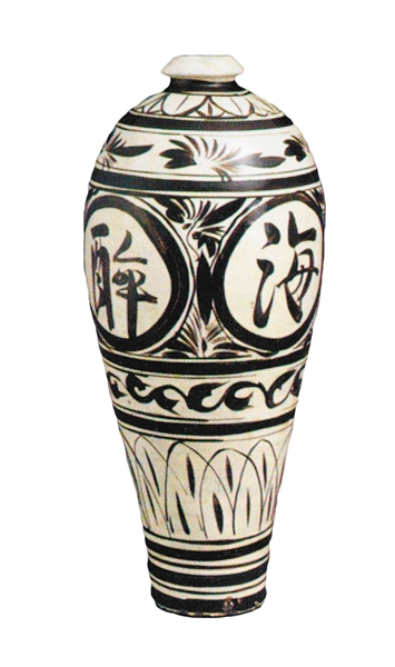 上海博物馆藏有一件宋磁州窑“醉乡酒海”经瓶,它高43厘米,口径4厘米,底径9厘米,小口,溜肩,上腹较鼓,下腹斜内收,小平底,整个造型挺拔俊秀,风格古拙淳厚。器体以粗线条的墨笔,勾画出五组纹饰,其中主题纹饰带有四个圆形开光,内写“醉乡酒海”四字,书体遒劲豪放,意境深邃广阔。