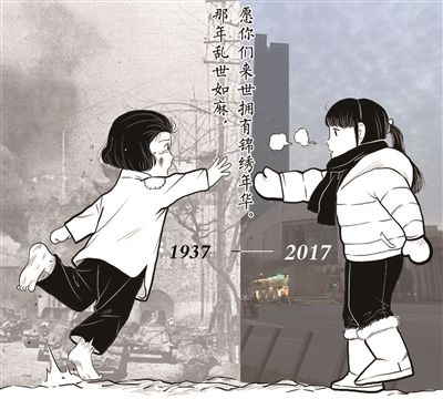 “那年乱世如麻,愿你们来世拥有锦绣年华”。昨日,这句话被许多网友转发提及,这句话来自于一张漫画图,图中两名分别来自1937年和2017年的女孩隔空相对,一人身边战火纷飞,一人身处和平现代。这幅图的作者朱彦告诉北京青年报记者,该图创作于去年12月,今年有网友把原图中的2016年换成了2017年,之所以想要画这张图,是因为想让大家不要忘记这段历史,而网友的大量关注在他们意料之外,“说明电竞竞猜想表达的情绪网友感受到了。”