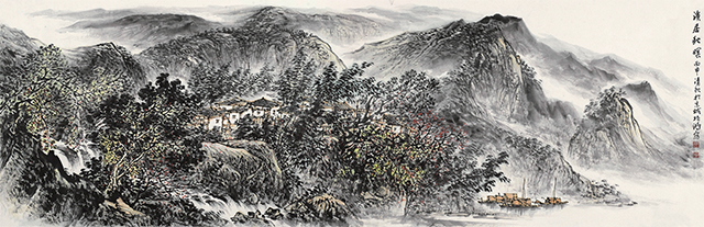 我比较喜欢《观云听松》《黄山烟雨图》《溪居秋瞑》等几幅大制作,我感到此类作品秀润恬淡、妩媚动人而又格局宏大、形势奔涌,秀美淡雅之中兼具威严肃穆之气。这些巨制巍峰耸立,气势堂堂;远山迷朦,意境幽深,给人以秀媚放逸、气势磅礴的审美震撼。