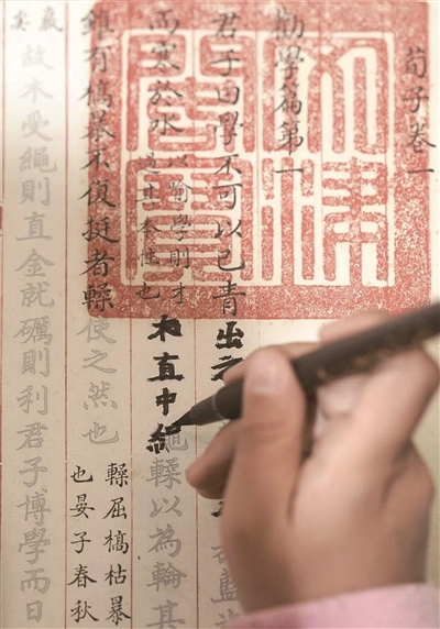 小学生受邀体验临摹四库底本的《荀子·劝学》 摄影/新华社记者 殷刚