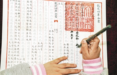 后来由于战火不断和保存不善,只有三部原本保存到今天。其中,国图藏文津阁《四库全书》是唯一一部原书、原函、原架保存至今的。文津阁《四库全书》共有36304册,分装于6144个木质书函,摆放在128个书架上。它在承德安静地存放了近130年,后来为了筹备京师图书馆,又从承德运回北京。1915年,当时的京师图书馆终于正式入藏了这部珍宝。之后九十余年中,全书又历经四次搬迁,终于白石桥总馆北区落成之后存于稽古、右文厅。据透露,读者抄写内容为文津阁《四库全书》本:《诗经·关雎》、《论语·学而》和《荀子·劝学》。