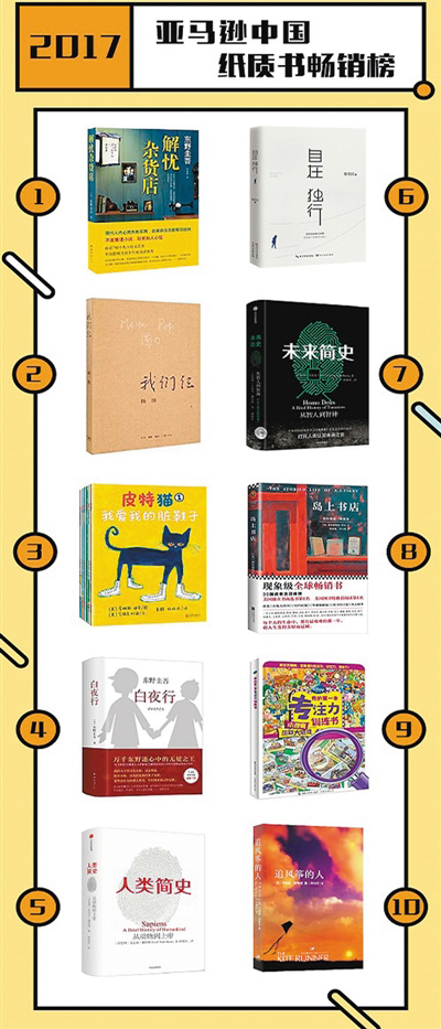 2017年亚马逊中国最畅销的纸质图书前三为《解忧杂货店》《电竞竞猜仨》和《皮特猫》,最畅销的Kindle付费电子书前三是《三体全集》《解忧杂货店》和《福尔摩斯探案全集》,乌鲁木齐、贵阳、兰州位居“挚爱阅读城市榜”前三。2017年重点书籍纸电同步发行的比率比去年增长近60%,二者相互促进效应明显。