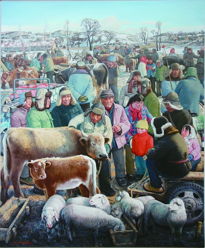 野草滩的牛羊集市(油画) 陈树中