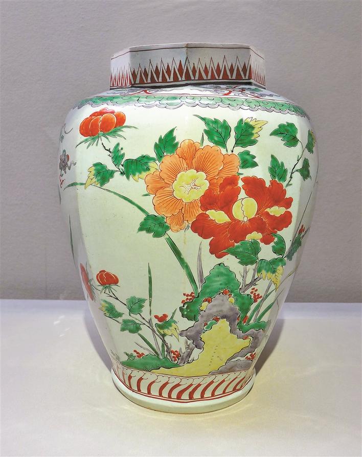五彩牡丹椿纹八角瓶,有田烧。江户时代17世纪后期。