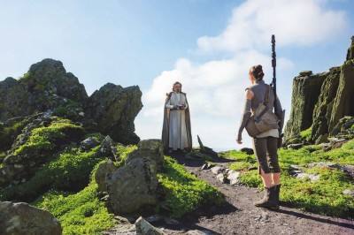 《星球大战8》频繁利用“造型”强化人物和空间的关系。卢克所在的小岛是全片唯一被阳光照亮的空间,嶙峋的礁石和翻滚的海洋衬托着人物的行动和心境,岛上自然光线的变化和人物的成长、取舍、牺牲等戏剧行为之间,产生强烈的隐喻关系。这种“光影”和“戏剧”高度契合的视觉风格,是默片时代的遗产。