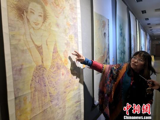 澳门女画家潘锦玲介绍自己的作品 索有为 摄