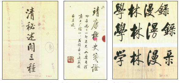 为出版物题写书名,启功先生按本意写作“题籖”,所钤印文亦然,现简写为“题签”。启功先生为出版社图书题签,数量至钜,这同题写牌匾、机构名称等一样,是他书法艺术实践的重要内容之一。启功先生为中华书局图书题签,按出版时间算,最早始于上世纪60年代初,即“辛亥革命五十周年纪念论文集”一幅,该集1962年出版。70年代初,他奉命从北京师范大学借调到书局参加“二十四史”与《清史稿》 的校点工程。当时能暂离校园风暴,脱身于批斗“臭老九”漩涡的启功先生,在庆幸自己能比较安心地在书局这一方小天地里奉献学问之际,更把书局称为自己的“第二个家”,自然愿为“自家”多做些力所能及之事———可惜当时书局也并非世外桃源,在发号施令的“造反派”眼里,这批有着“反动学术权威”等身份的人,是不准“乱说、乱动、乱写”的;尽管启功先生当时为书局一些员工书写过条幅 (大多是毛主席诗词),而题签甚寥,1973、1974、1975三年共六幅,且当时所出为数不多的图书中需学者题签者也不多。“文革”后,先生回师大继续任教,他在书法界的声名鹊起,随着书局出版的图书日益增加,无论是作者或编辑请启功先生题签的要求也持续不断。先生则一如既往地热诚允诺,及时书写,在1977、1978年所出图书中各有两幅,而改革开放伊始的1979年则有十二幅,为书局的文史类出版物增添了光彩。