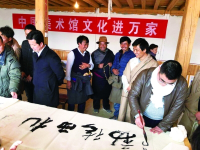 春节期间,中国美术馆送文化下基层小分队来到甘南藏族自治州迭部县,在弘扬优秀文化、引领文明新风的同时,也为山高路远的迭部送来文化祝福,丰富了高原民众的精神文化生活。他们为各族群众送去了新春文化礼物。其中,300余册精美的美术画册捐赠给迭部县图书馆。这些画册中的作品,都是近年来中国美术馆策划和举办的一系列重要美术展览的精品佳作。之后,他们还与甘南美协会员、甘南民族师范学院美术教师等美术工作者在座谈会上进行了深入交谈。小分队就甘南美术工作者较为关切的人文历史、民族文化、自然风光等甘南丰厚美术文化资源如何转化为丰硕美术创作成果的话题,给予了热情建议。春节前夕,中国美术馆还组织小分队赶赴江西省黎川县开展“文化迎春、艺术为民”系列惠民活动,将中国美术馆藏精品图书、年画拓片、扶贫慰问金、慰问品与中国美术馆的问候与祝福送到了黎川人民身边,为筑就人民的艺术之梦播撒了希望。