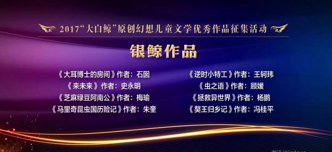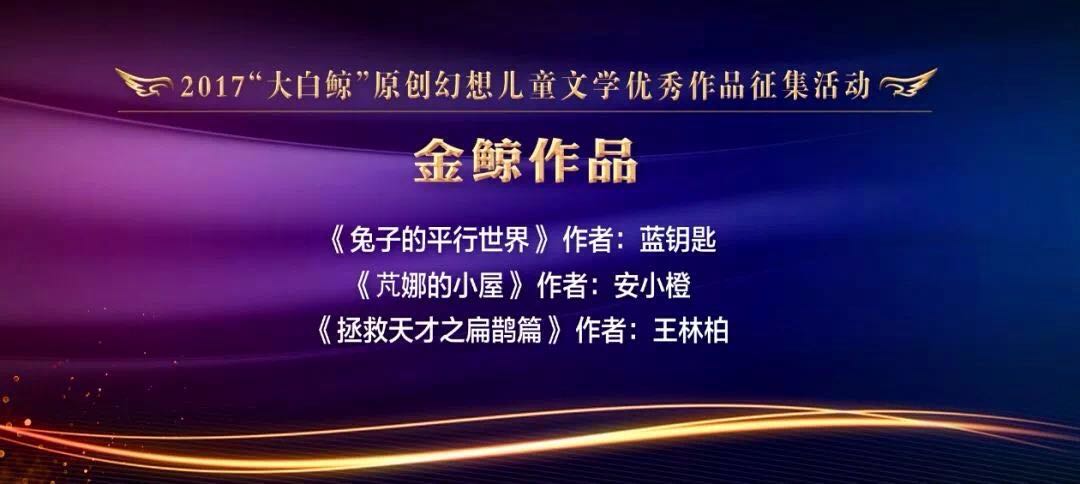 “大白鲸”原创幻想儿童文学优秀作品征集活动的目标是“保卫想象力”,目前已举办五届。2017年度征集活动共收到来自中国27个省市以及美国、德国、新加坡、马来西亚等国家和地区的近500位作者的538部作品。作品全程匿名,由评委投票选拔。最终,中国少儿科幻作家马传思凭借作品《奇迹之夏》摘得本届原创幻想儿童文学奖最高奖“钻石鲸奖”。杨紫汐和龙向梅,分别凭《星空街39号》和《生气的小茉莉》获得“玉鲸奖”。蓝钥匙的《兔子的平行世界》、安小橙的《芃娜的小屋》、王林柏的《拯救天才之扁鹊篇》等11部作品和7部原创图画书作品获“金鲸奖”和“银鲸奖”。