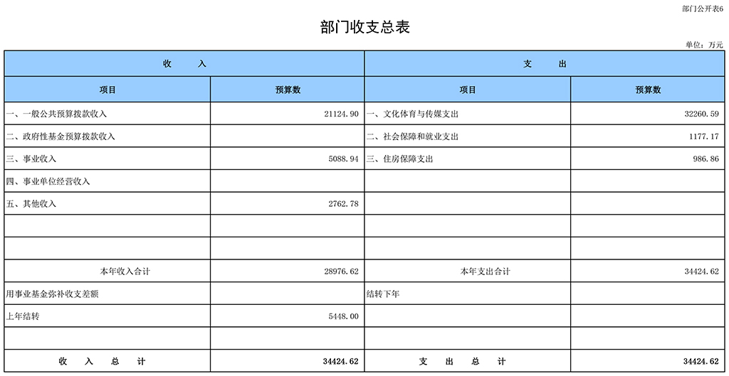 按照综合预算的原则,电竞竞猜官网所有收入和支出均纳入部门预算管理。收入包括:一般公共预算拨款收入,事业收入,事业单位经营收入,其他收入,上年结转。支出包括:文化体育与传媒支出,社会保障和就业支出,住房保障支出,结转下年。电竞竞猜官网2018年收支总预算34424.62万元。