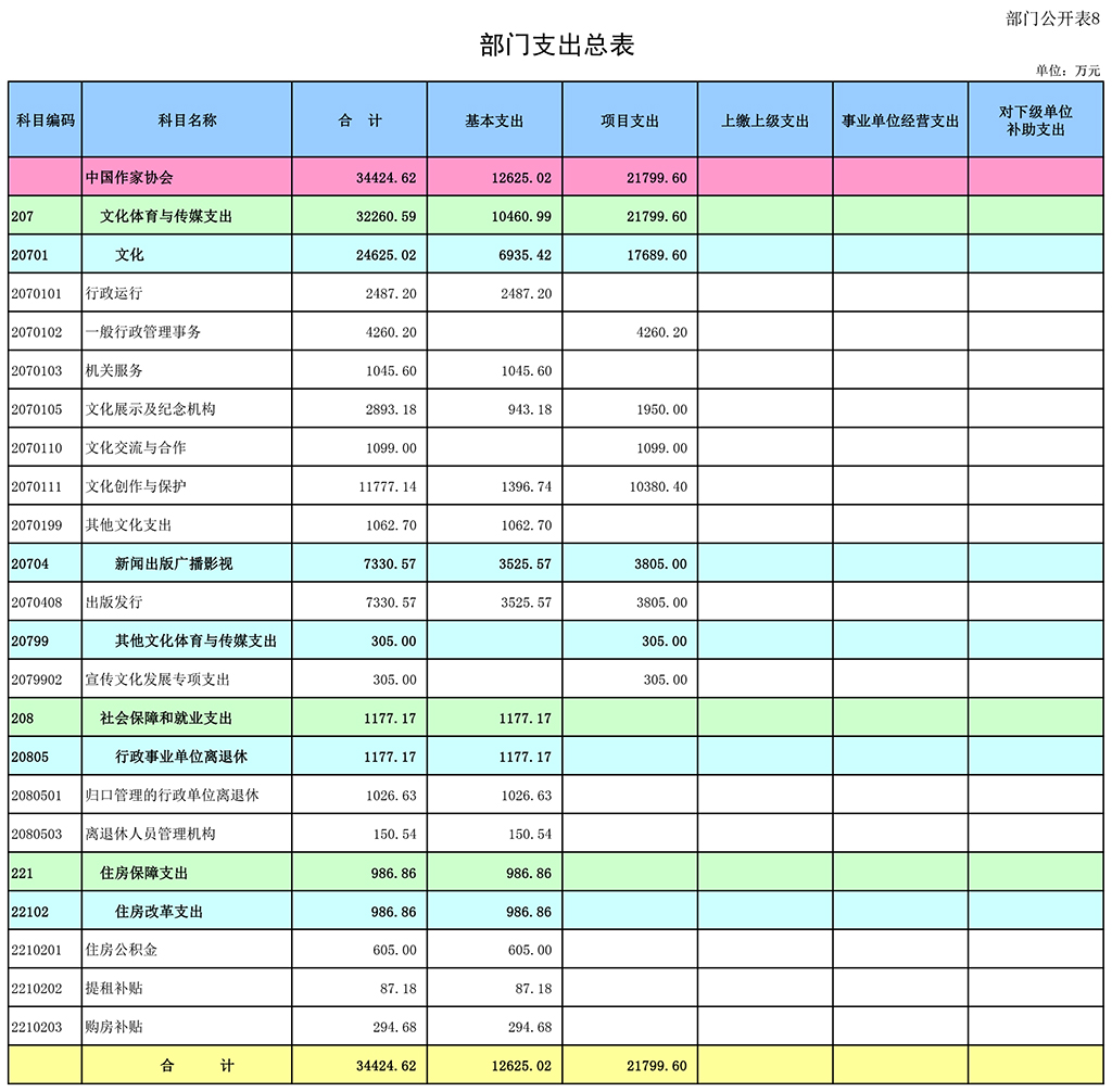 八、文化体育与传媒(类)文化(款)一般行政管理事务(项):指电竞竞猜本级组织作家深入生活等文学活动所需的项目支出。