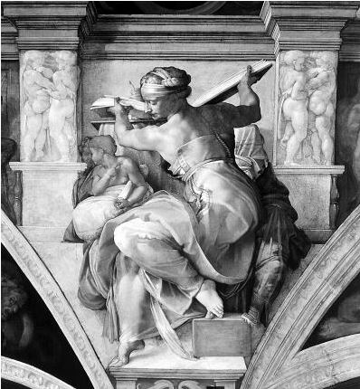 米开朗基罗为梵蒂冈西斯廷教堂所绘天顶画的一部分《女预言家利比亚》。