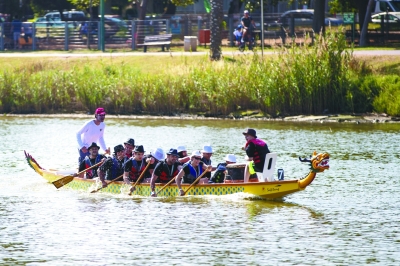 在以色列特拉维夫的亚尔昆河,龙舟队在比赛中向终点进发。图为新华社发