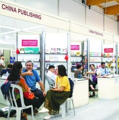 在第28届耶路撒冷国际书展上,一名书商(左二)与中国参展单位洽谈。图为新华社发