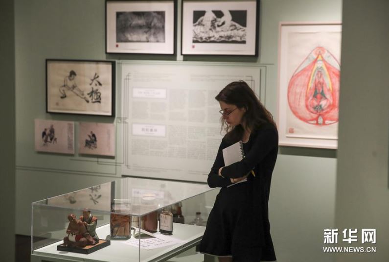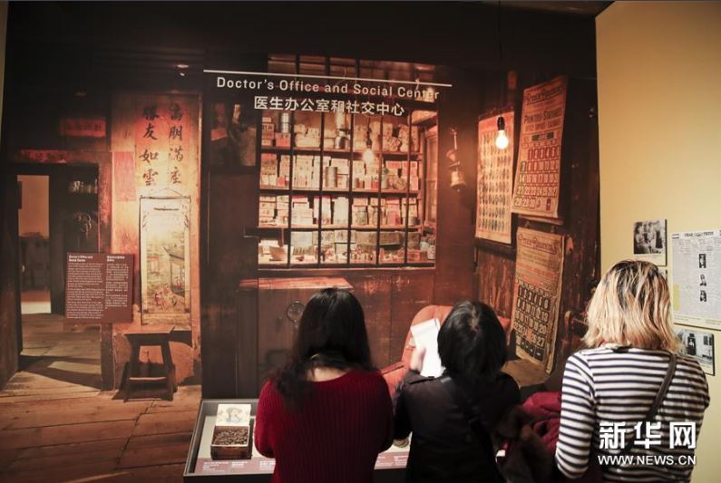 4月25日,在美国纽约华人博物馆举行的“中医在美国:理念、人与实践的融合”主题展媒体预展上,观众观看展品。美国华人博物馆25日首次推出反映中医中药在美发展历程的大型展览。展览从26日起对公众开放,并将持续至9月9日。