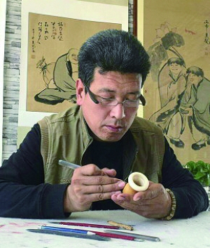 徐连龙说,真正开始下决心学习砑花葫芦,却是因为自己得了风湿病,“不能干重活,我就想,怎么也得学点手艺养活自己啊。”就这么着,徐连龙一边学习绘画,一边跟着爷爷学习砑花葫芦技艺。