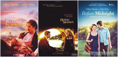 《爱在黎明破晓前》展现了这对男女初遇时的聪明和害羞,发生在20岁左右、人生第一次浪漫的偶遇;《爱在日落黄昏时》则在观众的翘首期盼中诞生,也如大家期盼的那样让两人在错过之后再次重逢。比起《爱在黎明破晓前》里两人想要了解对方的渴望,《爱在日落黄昏时》里的两人把欲望藏在了自我保护之下,随着他们一路走着,走过巴黎的大街小巷,才逐渐撕下伪装。而他俩中年的家庭生活转折点发生在《爱在午夜降临前》里,他们始终在讨论关于工作、孩子、休假等各种日常话题———展现出爱情在岁月和现实打磨后中更艰难的一面。