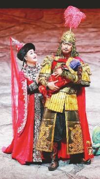 剧中的反面角色也非常有光彩,空吾尔巴依的野心和枭雄本色被男中音歌唱家耿哲演绎得非常到位,让人觉得这也是一个英雄,一个为了自己的民族拓展生存空间而奋斗的英雄。坎巧绕是属于内部的反面人物,但是这个众人眼中的恶人在男高音歌唱家李想的成功演绎下,演出了一种别样的英雄况味,成为第四幕最光彩照人的角色:他有野心,但是他也想继承玛纳斯,也想带领民族走向繁盛。应该说,他是骄傲的,对赛麦台依的背叛更多源于对命运的抗争。额尔奇吾勒作为一位史诗的传承者,更多体现出来的是“忠” :对玛纳斯的忠诚,对卡妮凯和赛麦台依的忠诚与守护,再没有谁比男高音歌唱家刘怡然更适合这个角色了。