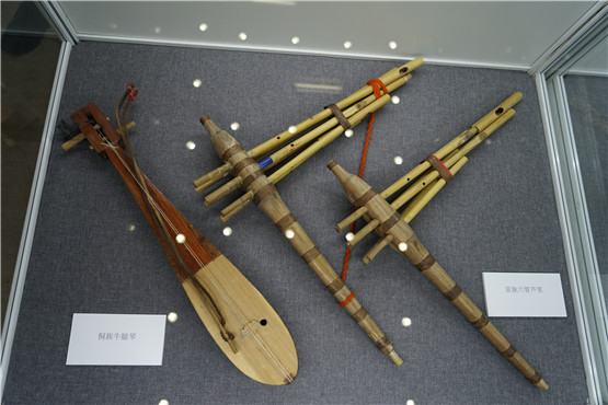 非遗展上展出的侗族牛腿琴(左)、苗族六管芦笙(右) 陈泽宇 摄