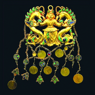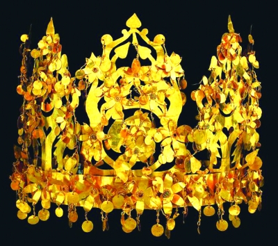 出土于蒂拉丘地墓葬群的众多金器是展览的最大亮点。这些璀璨夺目的金器,包括造型奇美、巧夺天工的纯金王冠;装饰有多组希腊酒神狄俄尼索斯徽章、工艺精湛的纯金腰带;足金打造的巴克特里亚阿芙洛狄忒金像的胸饰、骑海豚的厄洛斯金钩扣,以及镶满绿松石的黄金宝剑、嵌有众多宝石的黄金项链等,都是璀璨夺目的无价之宝。