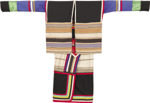 北京服装学院民族服饰博物馆藏基诺族砍刀布镶彩条女套装。