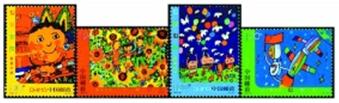 2009年6月1日,我国发行《祝福祖国》特种邮票,全套4枚,图案分别为“我爱中华”“快乐生活”“热爱和平”和“从小爱科学”。这套邮票通过少年儿童对自己美好生活的描绘,表现祖国六十年来的发展变化。经专家评审,来至江苏睢宁的4幅作品选为邮票图案印制成邮票。4幅儿童画的作者分别是宋志伟、刘茹、宋志威和孙鹏炎,年龄最小的只有6岁。