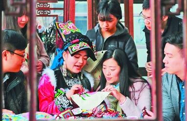 羌绣传承人在向青年学生讲解羌绣知识 光明图片