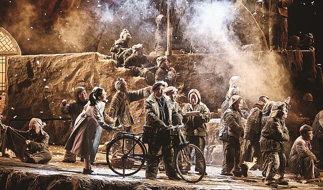 林荫宇:改编作品重要的是看编导者用什么样的叙述策略和舞台语汇来完成文本的转换。我从列夫·朵金执导的《兄弟姐妹》中就看到了导演驾驭原著的能力和水准。《兄弟姐妹》改编自前苏联作家阿勃拉莫夫的长篇小说《普利亚斯林一家》三部曲,自1985年首演以来,常演不衰30余年。舞台呈现上,列夫·朵金一方面通过精彩的舞台调度和场面展现人们的生存状态和思想情感,另一方面以陌生化手法,对人们生活中司空见惯的事物进行了间离,从而产生了震撼与感动。比如,剧中,男主人公米哈伊尔从前线回来了,母亲和弟弟妹妹们围在身边,他分发礼物:鞋、布、子弹壳,最后他托着一个布包说,这是最意外的礼物。家人们期待着,观众期待着……他一层一层地打开覆盖的布,露出了一整块黑面包!舞台上所有的人屏气凝神地注视着这块面包,那么神圣那么专注那么虔敬地凝望着它,一个长长的静场。这时,五六岁的小妹妹轻声地问:“妈妈,这是什么?”母亲表现出一种难以言说的难过:一个以面包与马铃薯为主食的民族,竟然不知道面包的模样。小女儿呀,你长这么大,还没见过它,不认识它!导演用这样一个细微的场面拨动了观众的心弦,仿佛一丝苦汁浸透心脾。